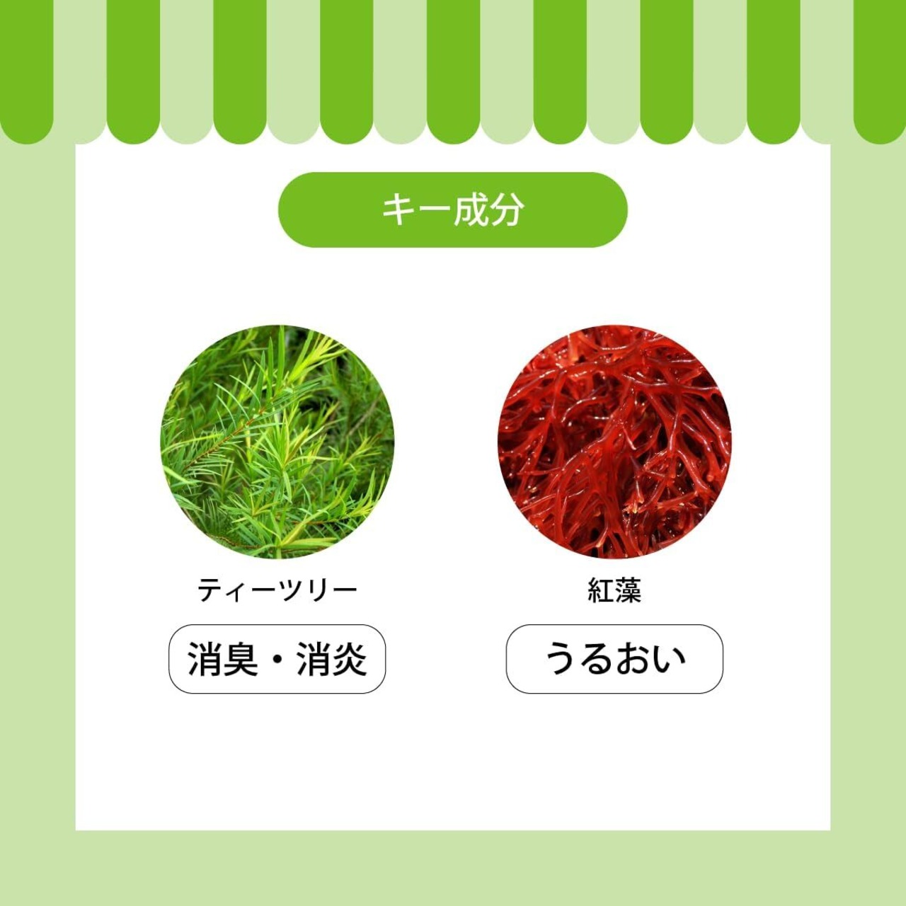 ティーツリーオイル、紅藻エキス、ヒアルロン酸ナトリウム、ユーカリオイル、ローズマリーオイル、ラベンダーオイル、シトロネラオイル、ビタミンE、香料、保存料