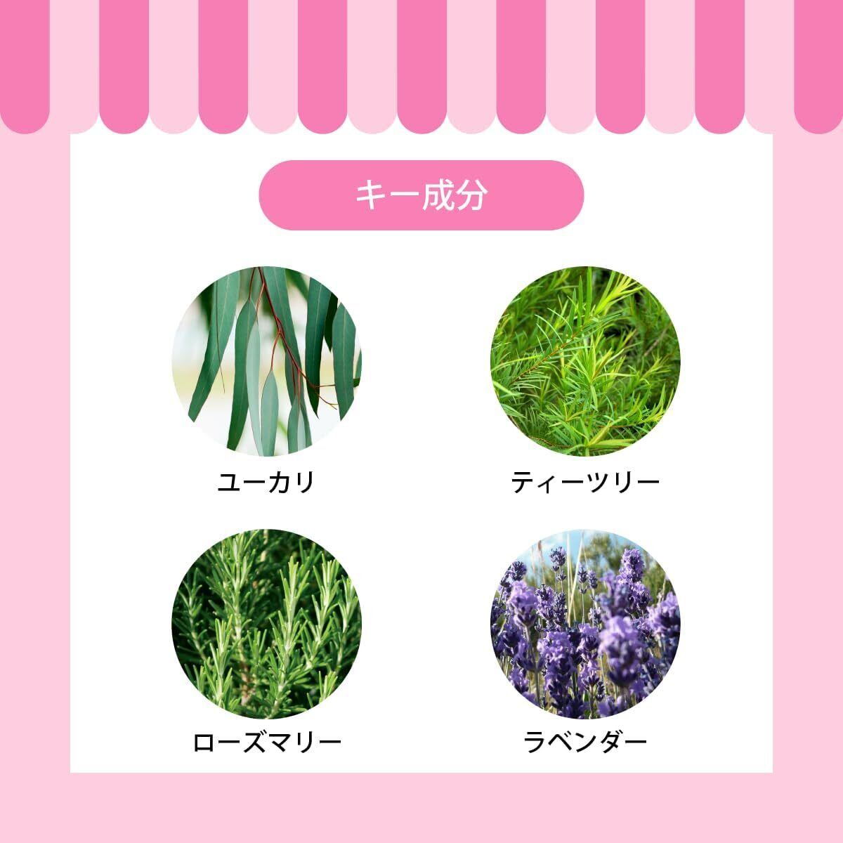 ユーカリオイル、ティーツリーオイル、ローズマリーオイル、ラベンダーオイル、マカダミアナッツオイル、ベジタブルグリセリン、アラントイン、ピロクトンオラミン、保存料 など