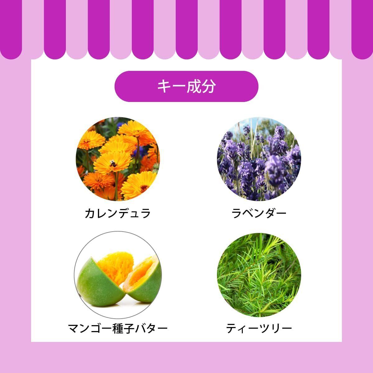 ・天然保湿成分カレンデュラ、マンゴー種子バター、カレンデュラ、ラベンダーオイル配合