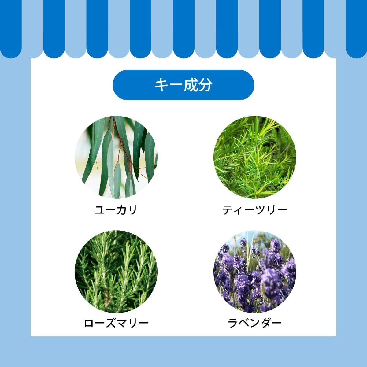 ティーツリーオイル、ユーカリオイル、ローズマリーオイル、ラベンダーオイル、シトロネラオイル、リモネン、グリセリン、重曹、エタノール、紫外線防止成分、香料、保存料 など