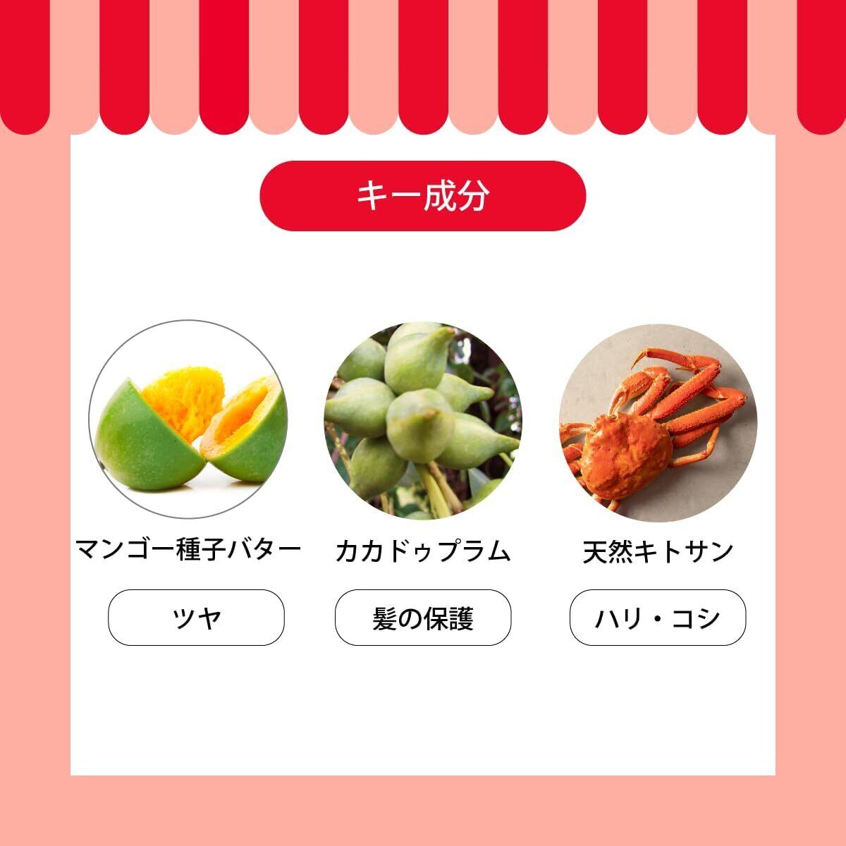 マンゴー種子バター、植物性アミノ酸、キトサン、カカドゥプラム、ユーカリオイル、ローズマリーオイル、ラベンダーオイル、ティーツリーオイル、シトロネラオイル、ブレンドエッセンシャルオイル、香料、保存料 など