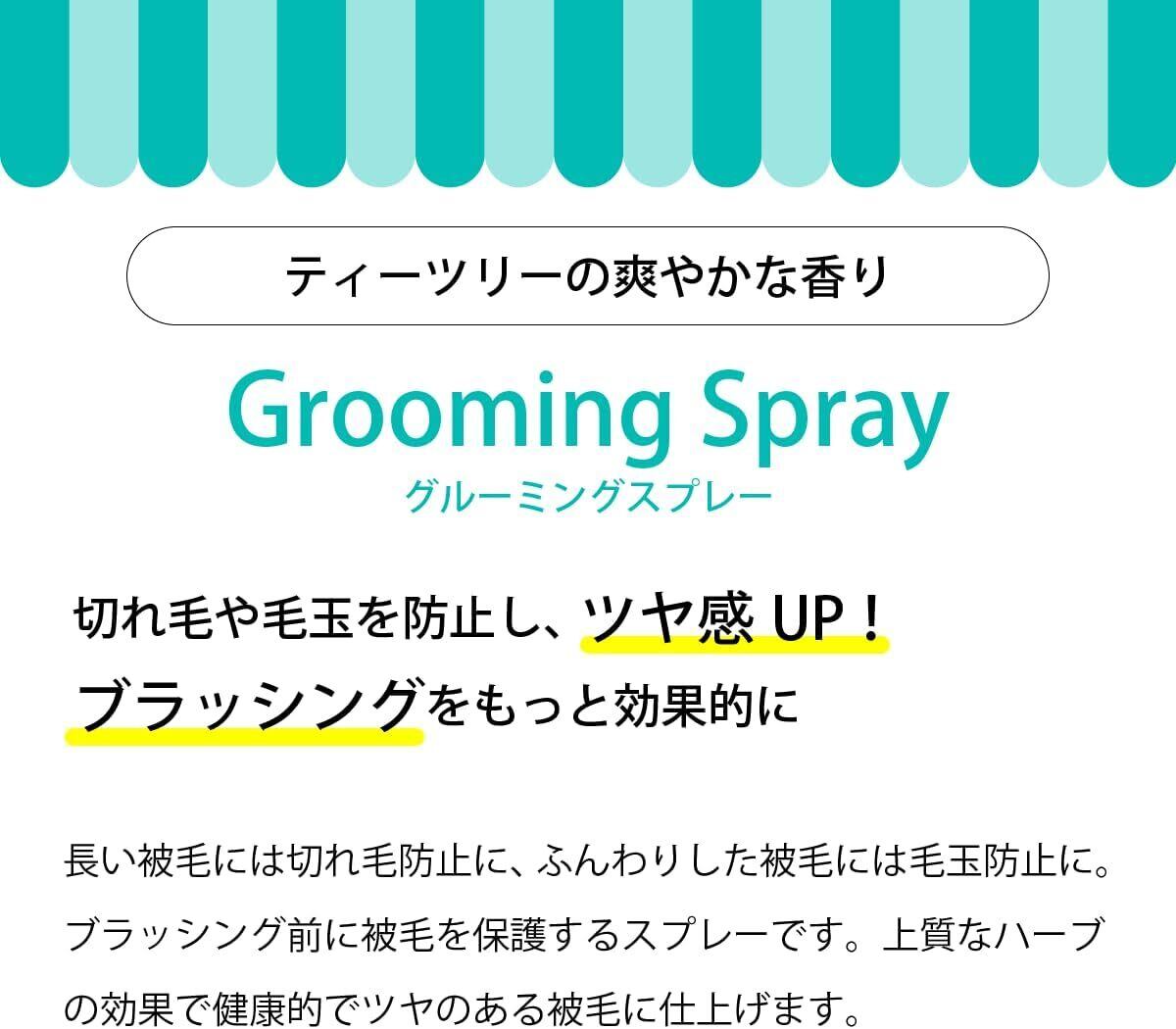 長い被毛には切れ毛防止に、ふんわりした被毛には毛玉防止に。ブラッシング前にスプレーする被毛を保護するスプレーです。保護成分が静電気を抑えて、ブラシの通りをスルリとなめらかにしてくれます。また、シャンプー前に使用すれば、毛玉除去にも効果を発揮します。